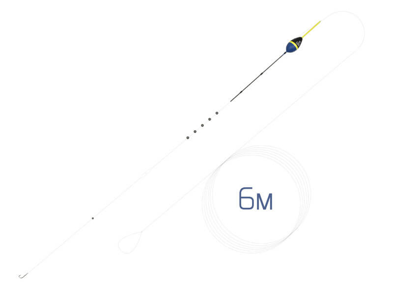 Gotowy 6-metrowy zestaw do łowienia na tyczkę zawiera spławik w kształcie łezki o wadze 0,5-3 g, wyważony śrutem ołowianym i wyposażony w przypon oraz haczyk.
